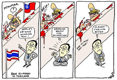 Not for him bold speeches or attempts to mobilize public opinion behind what could be an organization that helps tackle nuclear proliferation or reconstruct Afghanistan. Not for him championing human rights, or even rallying in defense of beleaguered civilians. Visiting Malta in April for yet another honorary degree, he was evasive when asked about the island's penchant for sending illegal African immigrants packing off to Italy, saying, "I am not in a position to intervene." As tens of thousands of Tamil refugees lingered under fire on a narrow strip of beach in Sri Lanka, Ban and his advisors did little more than huddle in New York and wring their hands, only making a trip to the war zone after hostilities ended. Under his stewardship, the United Nations isn't merely an unhelpful place—it's a largely irrelevant one.